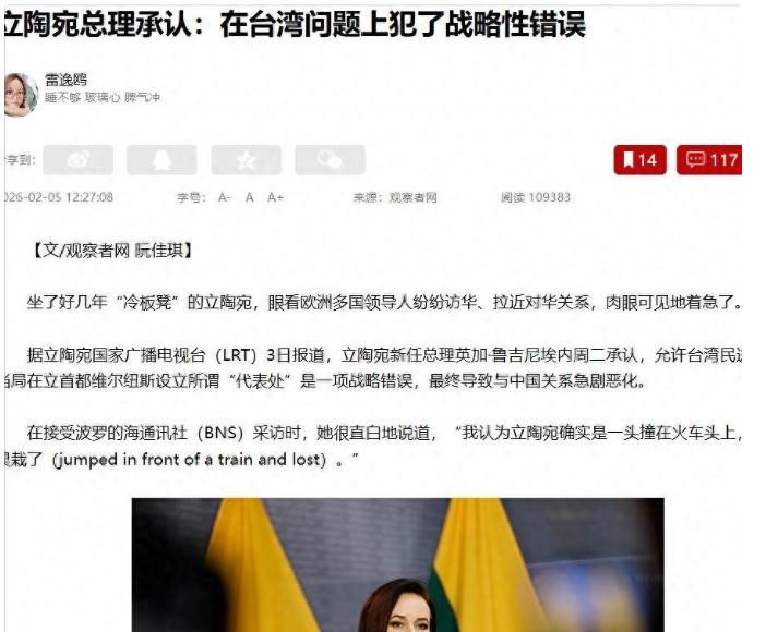 2026年2月,立陶宛新任总理鲁吉尼埃内公开承认,当年允许台当局设代表处是“重大战略错误”,就像“一头撞在火车头上,结果栽了”。